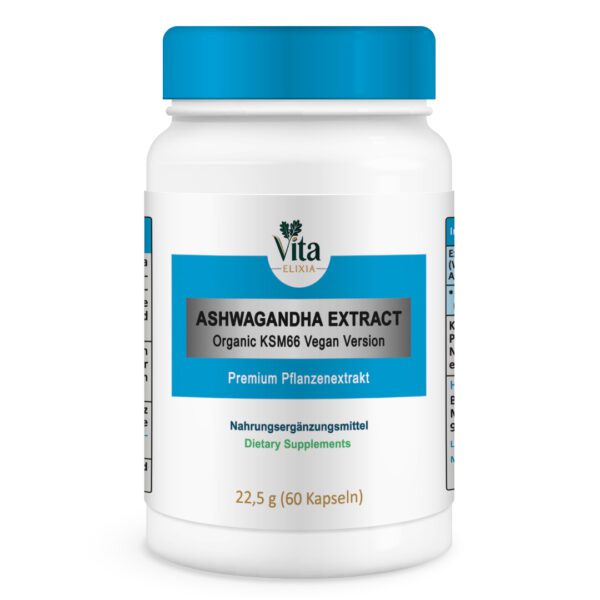 VITA ELIXIA® Ashwagandha-Extrakt wird mit KSM-66® formuliert, das als einer der klinisch am besten erforschten Ashwagandha-Wurzelextrakte auf dem Markt gilt. Diese von der Blumental Bayern GmbH entwickelte "Bio-KSM-66 Vegane Version" stellt sicher, dass Sie einen Extrakt mit vollem Wirkungsspektrum erhalten, der das natürliche Gleichgewicht der verschiedenen Inhaltsstoffe des ursprünglichen Krauts bewahrt.