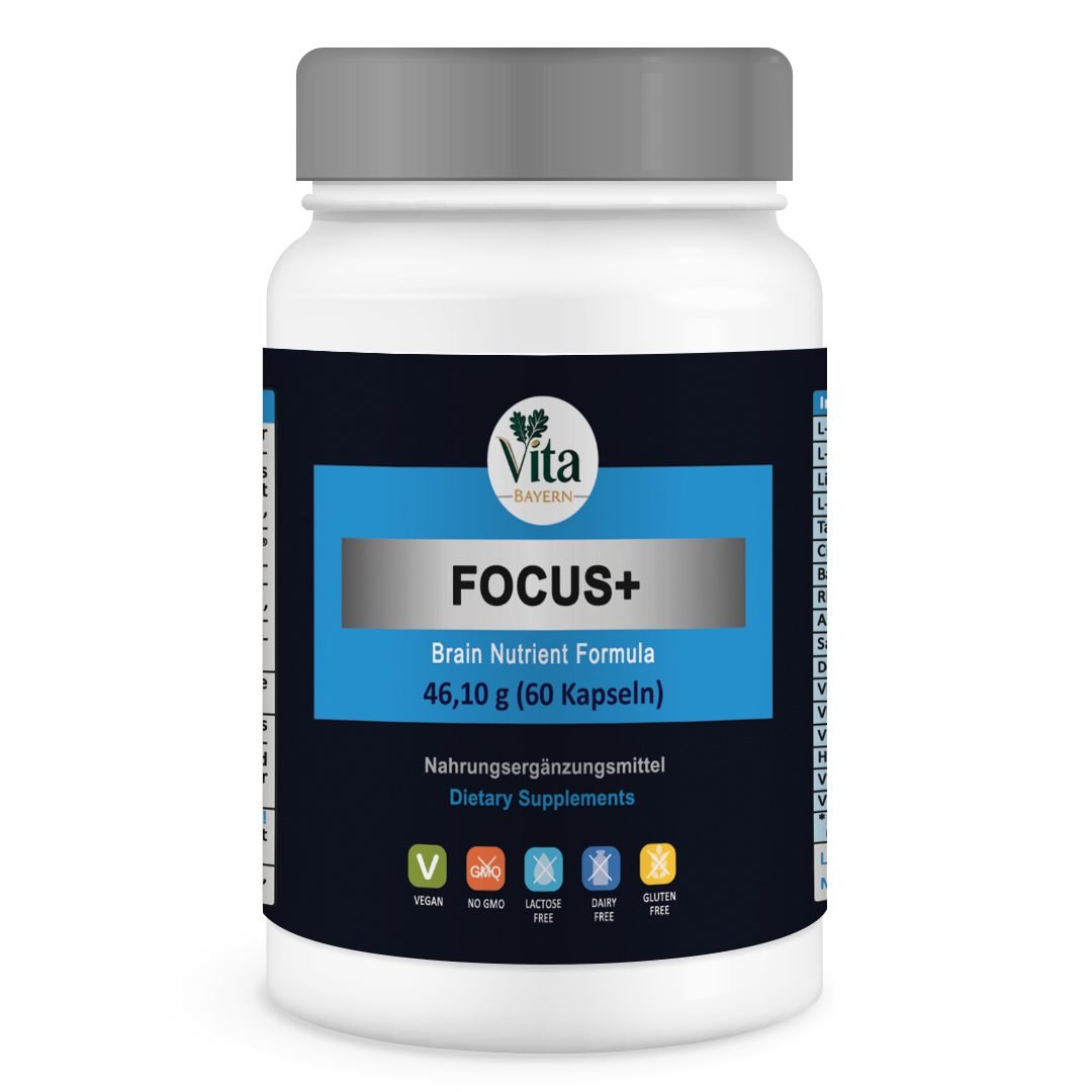 Focus+ enthält eine Kombination aus pflanzlichen Inhaltsstoffen und anderen Substanzen, die üblicherweise in Nahrungsergänzungsmitteln verwendet werden, darunter Bacopa monnieri, Rhodiola rosea, Ashwagandha (KSM-66®), L-Carnitin und Citicolin, zusammen mit ausgewählten Vitaminen. Diese Inhaltsstoffe sind Teil der Gesamtrezeptur, die darauf abzielt, die Ernährung mit Mikronährstoffen und anderen Komponenten zu ergänzen.